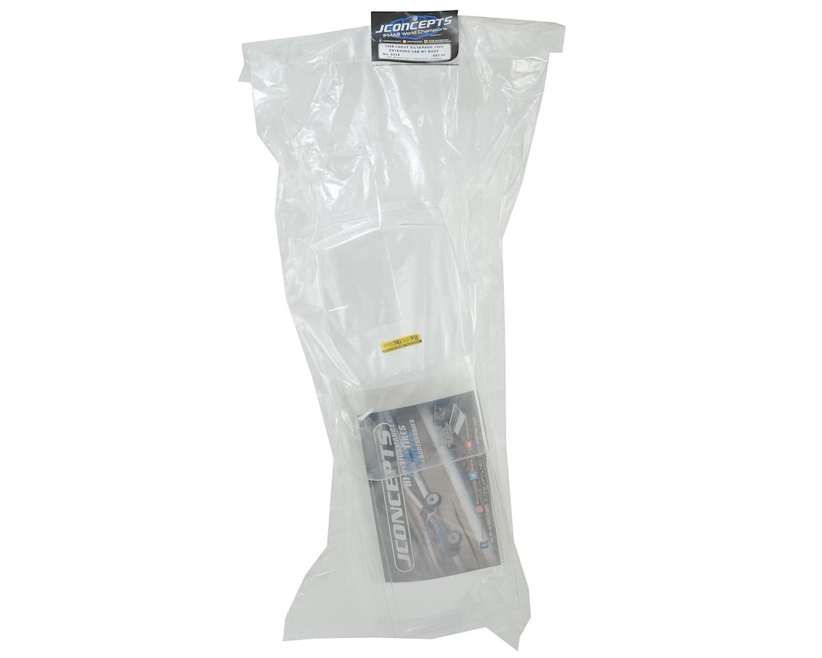 The JConcepts 1988 Chevy Silverado Extended Cab Monster Truck Body features authentic 1988 bow-tie styling that is clean, refined and doesnt carry over the boxy looks from the early 80’s. The fleetside, extended cab design is spot-on featuring slight curvature to the main shape, new headlights, grille treatment and form-fitting wheel wells. The slight flare to the tire openings give just a little wrinkle to the bed-sides and front fenders to accommodate different sized tires for maximum versatility.