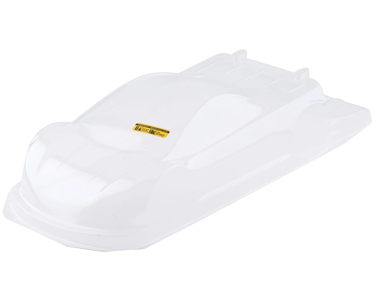 The rear section of this body has plenty of deck overhang. This rear overhang is a very important part of the body which controls down-force and provides the placement for the rear wing. A small built-in spoiler is located at the tail end of the body to help stabilize the car at high-speed. To complete the look the bubbled roof profile and minimally structured greenhouse area allows the body to blast through high-speed sections.