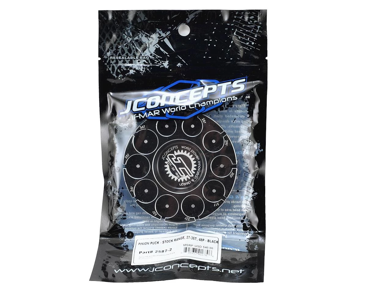The JConcepts Aluminum Pinion Puck – Stock Range – features laser etching to indicate proper sizing; ranging from 27-36T in 48 pitch. The center features a recess to hold small components and also etched to indicate overall size of the Puck while displaying JConcepts branding. The Puck is available in blue or black colors and features the silver chamfered edging which highlight an innovative design.