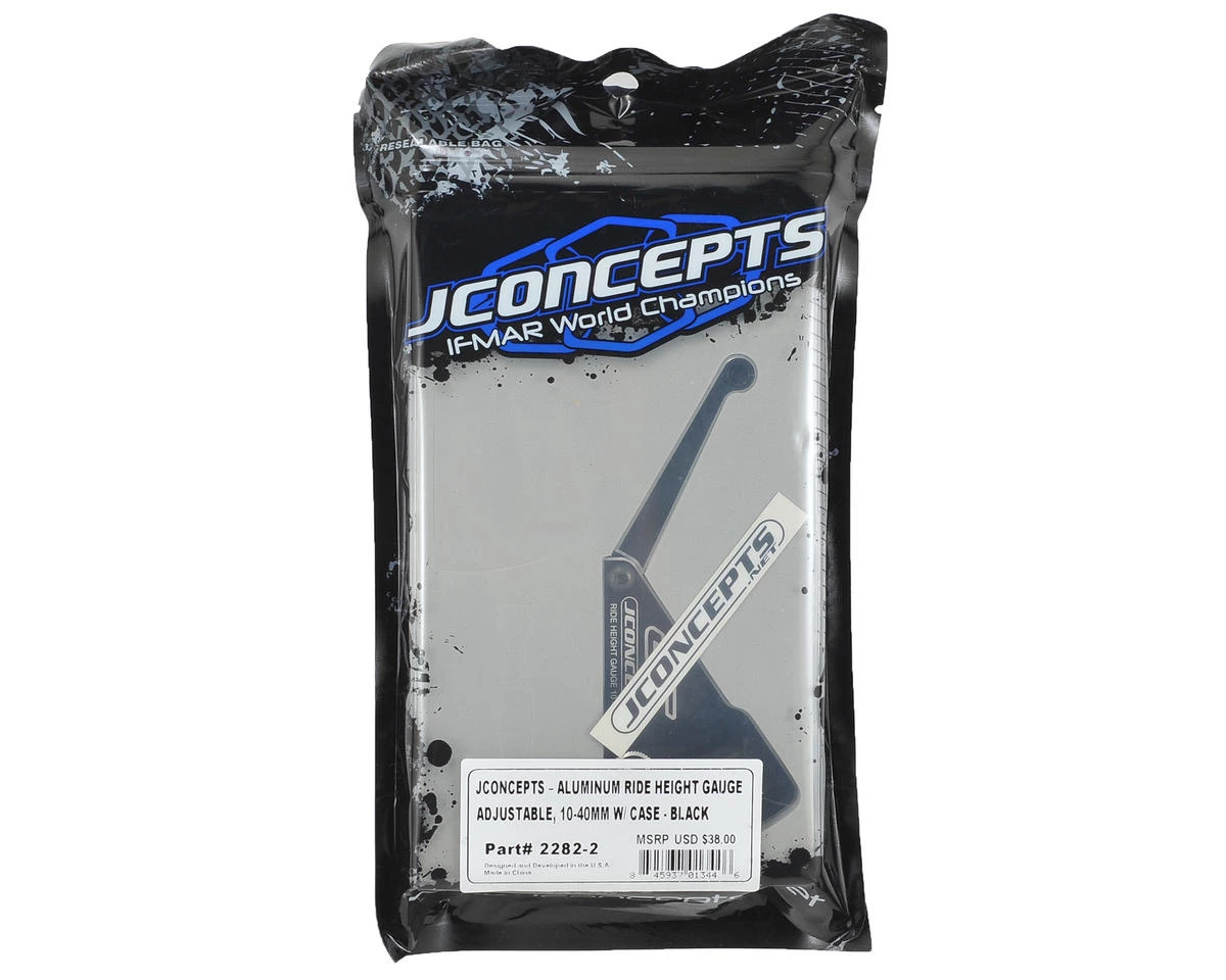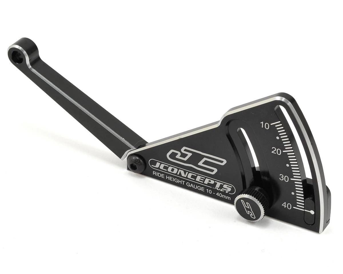 This is the JConcepts Aluminum Ride Height Gauge. A successful off-road racing program requires precise and accurate setup. Machined from billet aluminum, the JConcepts ride height gauge is a high spec, detailed instrument that provides the precision your car deserves. The high polish, laser etched gauge features graduated measurements from 10-40mm so it can be used on a variety of vehicles. The ride height gauge is preassembled with 4mm hardware for the pivot, with a 3mm setscrew and thumbscrew as the setting knob. The structure features chamfered silver edging to highlight the design and the touch-off point on the gauge is a rounded boss that always meets the chassis at the proper angle. Each gauge includes a latched box with foam insert that fits snugly around the tool, keeping it safe wherever you go.