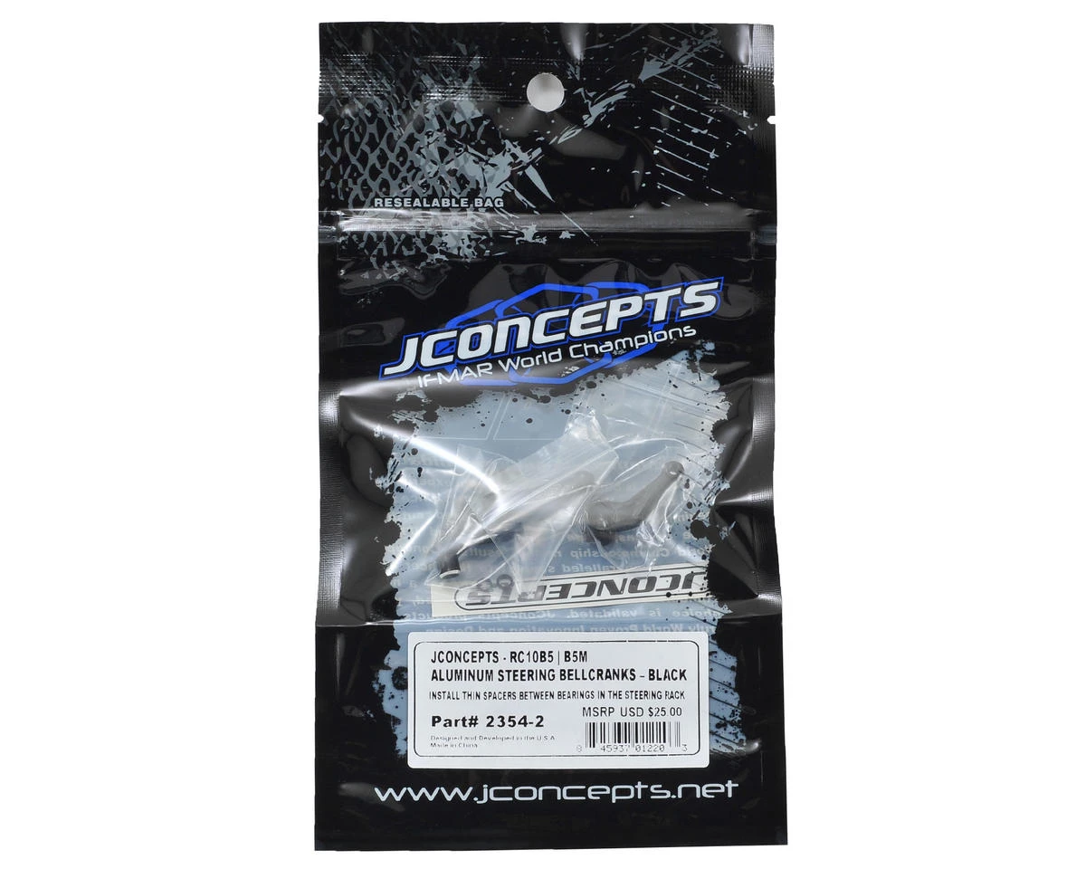 This is the JConcepts Aluminum Steering Bell Crank Set. Compatible with the B5, B5M and T5M, this servo saver-less aluminum steering system is CNC-machined and replaces the stock plastic bell-cranks. Available in blue or black anodized finish, these bellcranks sport a machined chamfered silver edges and engraved JC logos. The aluminum, light-weight assembly provides a more rigid steering system with increased steering feel and response. The fit of the bell-cranks has also been improved by the positioning of the bearings to help eliminate binding when assembled.