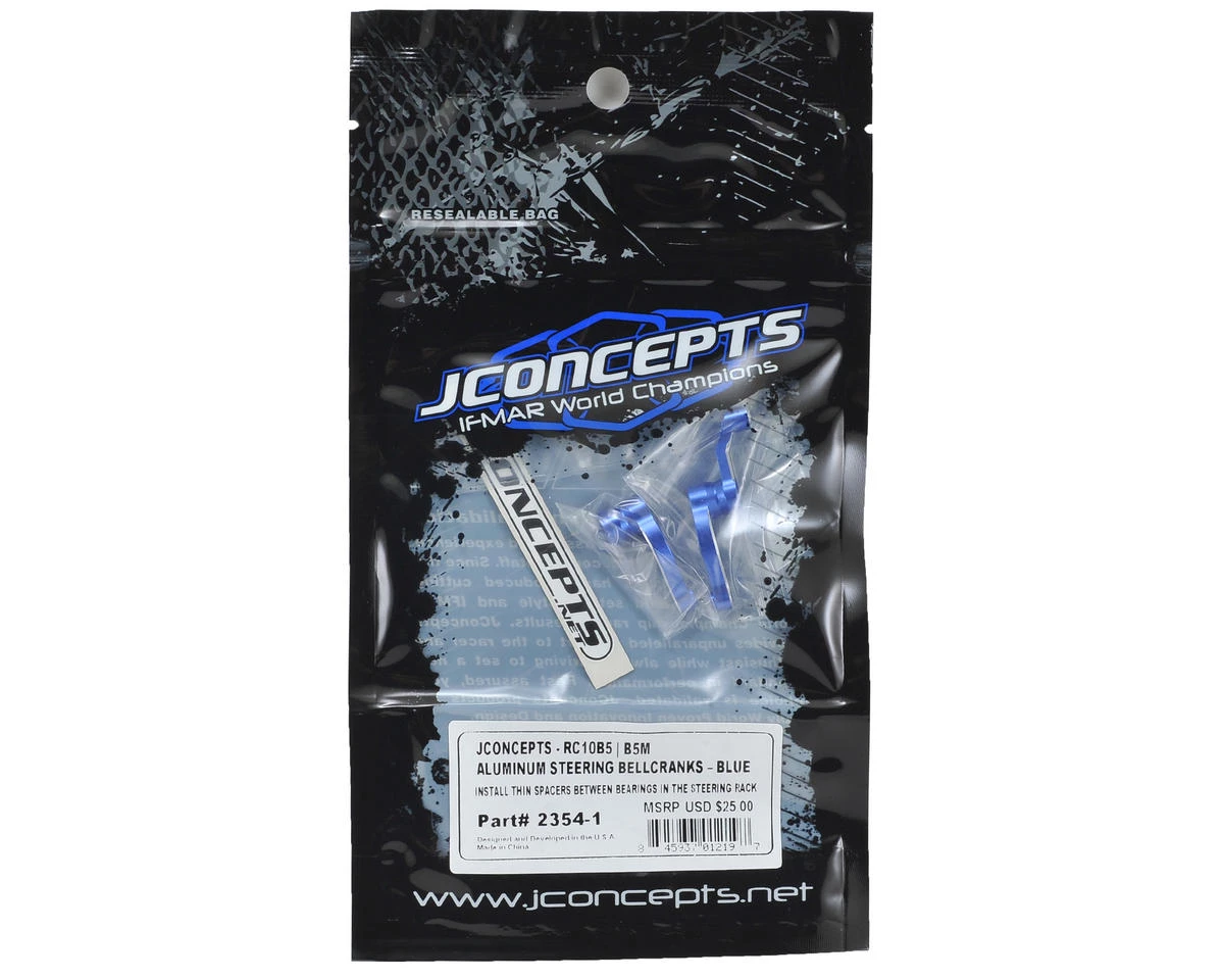 This is the JConcepts Aluminum Steering Bell Crank Set. Compatible with the B5, B5M and T5M, this servo saver-less aluminum steering system is CNC-machined and replaces the stock plastic bell-cranks. Available in blue or black anodized finish, these bellcranks sport a machined chamfered silver edges and engraved JC logos. The aluminum, light-weight assembly provides a more rigid steering system with increased steering feel and response. The fit of the bell-cranks has also been improved by the positioning of the bearings to help eliminate binding when assembled.