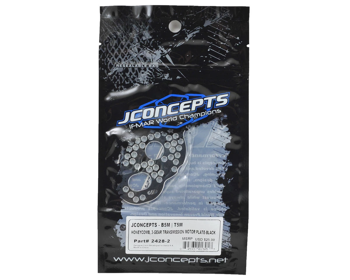 This is an optional JConcepts Aluminum B5M “3 Gear” Honeycomb Motor Plate. JConcepts has created a sweet looking upgrade motor plate for the popular 3-gear transmission upgrade available for the B5M, T5M and SC5M vehicles. The design team at JC have incorporated a honeycomb milling affect with placement more suited to surrounding geometry making the plate lightweight and very rigid in multiple directions. The honeycomb features add a 3D look especially as they remain natural aluminum while the rest is available black or blue in color. Slight chamfering on the 3mm thickness material allows the rather beefy plate to look quite skinny.