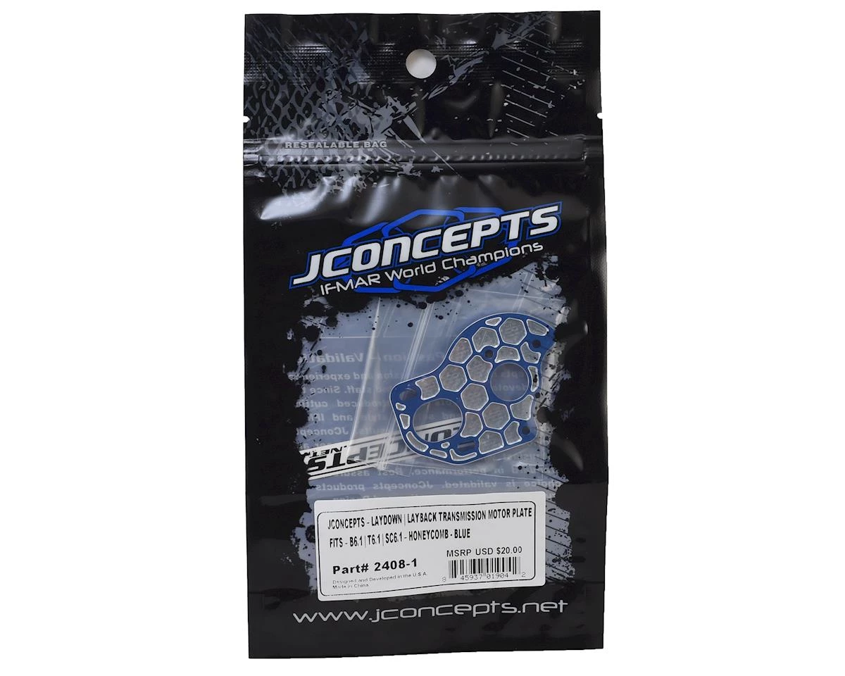 JConcepts has rolled out a sweet looking replacement motor plate for the B6.1 | B6.1D | T6.1 | SC6.1 vehicle line-up with laydown and layback 3-gear transmission. With the evolution of race tracks, high flying jumps are becoming the normal obstacle. It’s inevitable that a driver will have a miscue and challenge the durability of the vehicle. Looking at the typical construction of the second operation processes on standard motor plates, it easy to see why bending is sometimes an issue. The design team at JConcepts has incorporated a honeycomb milling affect with placement more suited to surrounding geometry making the plate light-weight and very rigid in multiple directions. The honeycomb features add a 3D look featuring the natural aluminum while the rest is available blue or black anodized colors. The motor plate is compatible with the Team Associated B6.1 spur gear guard and remains light-weight. Slight chamfering on the 3mm thickness material allows the rather beefy plate to look quite slim and trim.