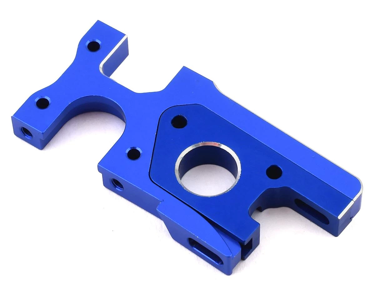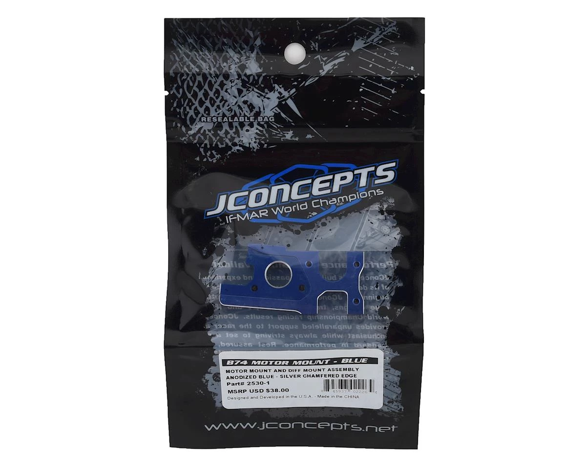 The JConcepts B74 Aluminum Motor & Differential Mount Set is machined in high-grade aluminum and anodized blue for top-notch looks. This option part aligns and drops under the center diff/slipper and attaches to the chassis using the stock hardware. The mount attaches to the motor with the stock hardware and stays with the motor during installation and routine in and out procedures. Once the motor is slid into the diff mount, the rigid assembly and light-weight construction of the mount is a perfect complement to the B74. Top off the center diff/slipper section with the center bulkhead top-plate (JCO2531 – not included) for a robust assembly.