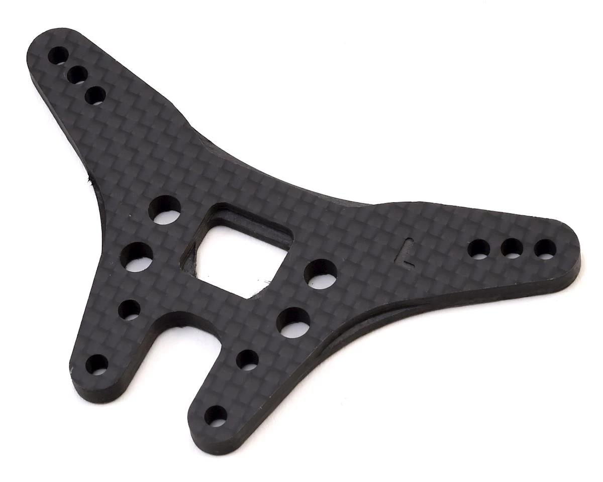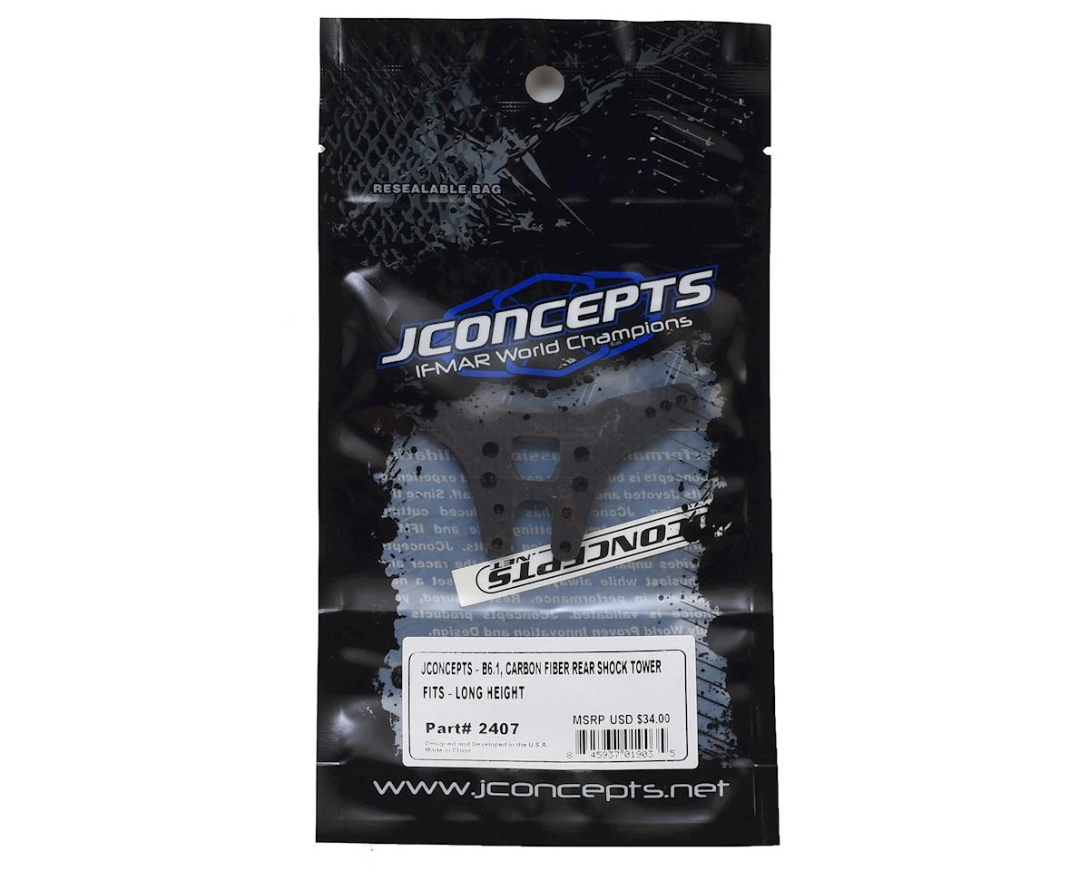 This is an optional JConcepts “Long” Carbon Fiber B6.1/B6.1D Rear Shock Tower. JConcepts has delivered on a beefy Carbon Fiber rear long configuration shock tower option for the popular Team Associated B6.1 | B6.1D vehicles. The 4mm thickness, genuine Carbon Fiber material is durable, light-weight and features the JConcepts milled sections which help maintain strength while minimizing weight. The 3 standard (B6.1) shock positions remain for quick and steady adjustments in the correct position for the long B6.1 | B6.1D length shocks.
