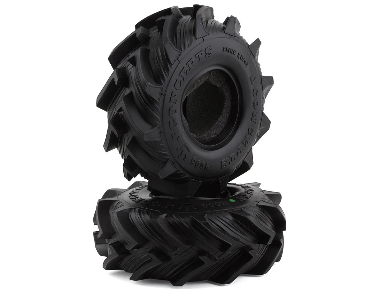 This is a set of JConcepts Fling King 1.9″ Tires, specifically designed to throw mud, dirt, gravel and grass just like the real thing. The giant sized tires are tall enough to dance through the deepest RC loam, however, it’s the tall lugs that separate them from the rest. The 1:1 tires were hand-cut to produce the most wicked looking tires on the block. The JConcepts tires are uniquely built to replicate a hand-cut set, however, deep tread remains to do the “mega” land damage the drivers and enthusiasts crave.