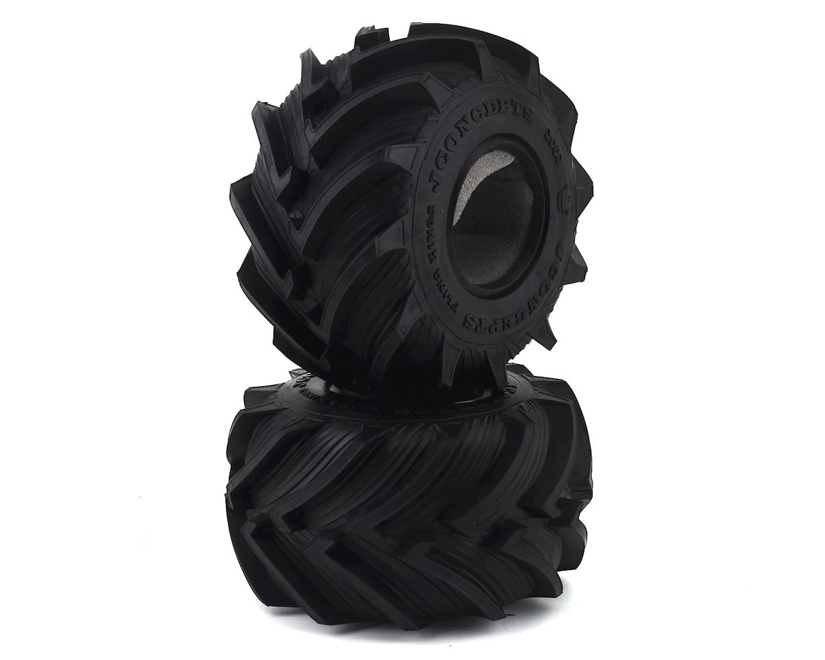 One of the most impressive details about the Fling Kings, they are designed for a JConcepts 2.2” wheel, making them aggressive in appearance. The bead of the tire features the traditional 2 step surface which provides a massive amount of area for glue to rest giving real security for full-throttle mud runs. No details were spared on these mud runners, the V-type tread is replicated to a T and the top of the tread carries a slight recess adding a little touch of depth to the appearance. Off to the side, the tire lettering hits hard with retro style JConcepts lettering, Fling King logo and crown with #3083 part number for easy identification.