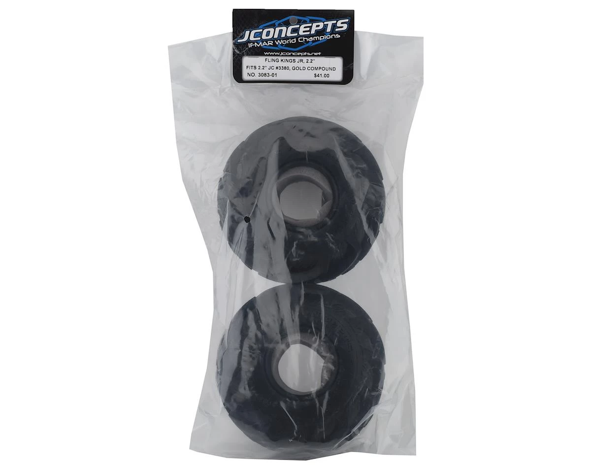 The soft “blue” compound which is recommended for dirt, grass and asphalt feels noticeably mushy and sticky and has expanding characteristics and tend to “pizza cutter” during flat out high-speed runs. The “gold” compound feels harder to the touch, excels on polished or hard surfaces, and expands less during high speeds. Fling King tires are complete and include open cell “React” inserts to support the grippy tires. The Fling Kings measure in at 5.50 x 2.5 x 2.2” and are available in two the different compounds mentioned above and fit directly to JConcepts wheels.