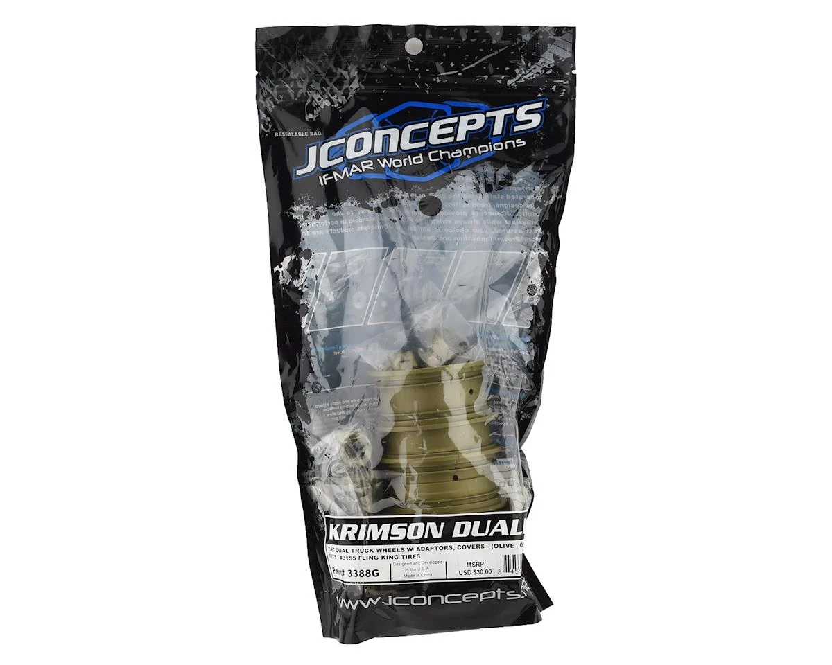 This is a set of JConcepts Krimson Dually 2.6″ Dual Truck Wheels with Adaptors and Covers. In the 1980’s it was very common for early Monster Truckers to use dual wheel tires to accomplish what one large Terror Tire could do. JConcepts saw this and has designed and produced a very special wheel for builders and drivers wanting to double up on the competition.