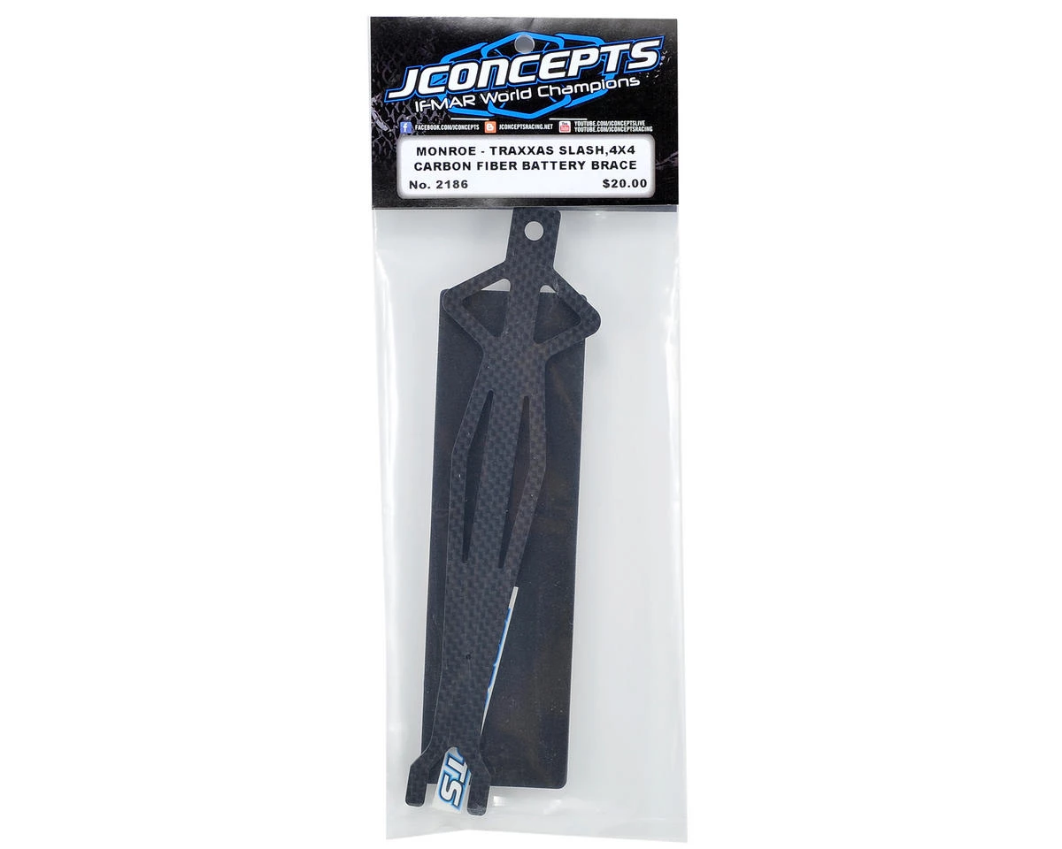 This is an optional JConcepts “Monroe” Carbon Fiber Battery Brace, and is intended for use with the Traxxas Slash, Slash 4×4 and Stampede 4×4 trucks. Battery braces are a highly visual and critical part of any electric R/C vehicle. Braces provide the security of the main power source on the vehicle as well as provide a look and feel to each vehicle. In addition, they give the user a quick way of accessing and performing a battery change or routine maintenance to the vehicle. The Monroe battery brace by JConcepts is highly functional and aesthetic eye-candy, machined from genuine 2.5mm Carbon Fiber, it performs as good as it looks. Ā