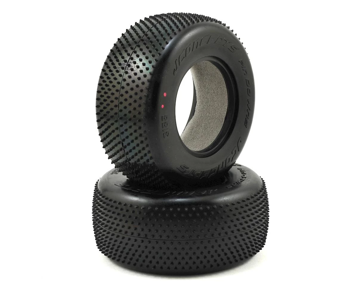 JConcepts Pin Downs Carpet Short Course Tires feature a pin spiked tread, which is directional for added performance and stability. The directional nature of the pins were positioned to allow broken-in type pins to grip the surface in one direction, while the pins are more upright when oriented in the opposite direction. The bottoms of the pins have heavy radiuses which allow the pins to wear more consistently and not tear or rip off the carcass prematurely. The tires are designed for the industry standard SCT wheels, available from JConcepts (JCO3344 – AE; JCO3352 – TLR).