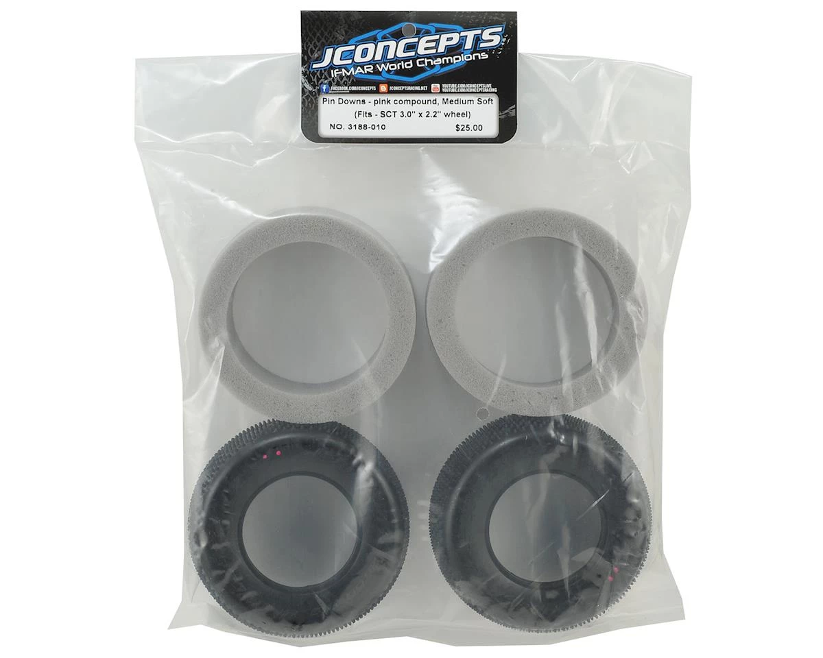 The tire carcass itself has been refined to reduce weight while maintaining strong sidewall support. The pink compound marked with 2 pink dots on the tire represents a new compound for JConcepts, a medium soft material with good wear characteristics. The rear tires include gray, open cell inserts making them a complete set ready to mount, straight out of the package. The Pin Downs work best on Carpet and Astroturf tracks where typically a small pin tire is working.