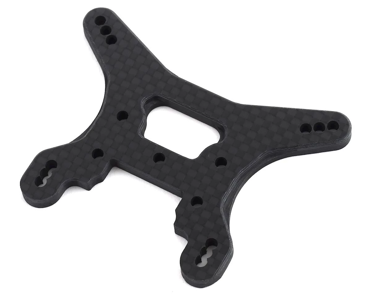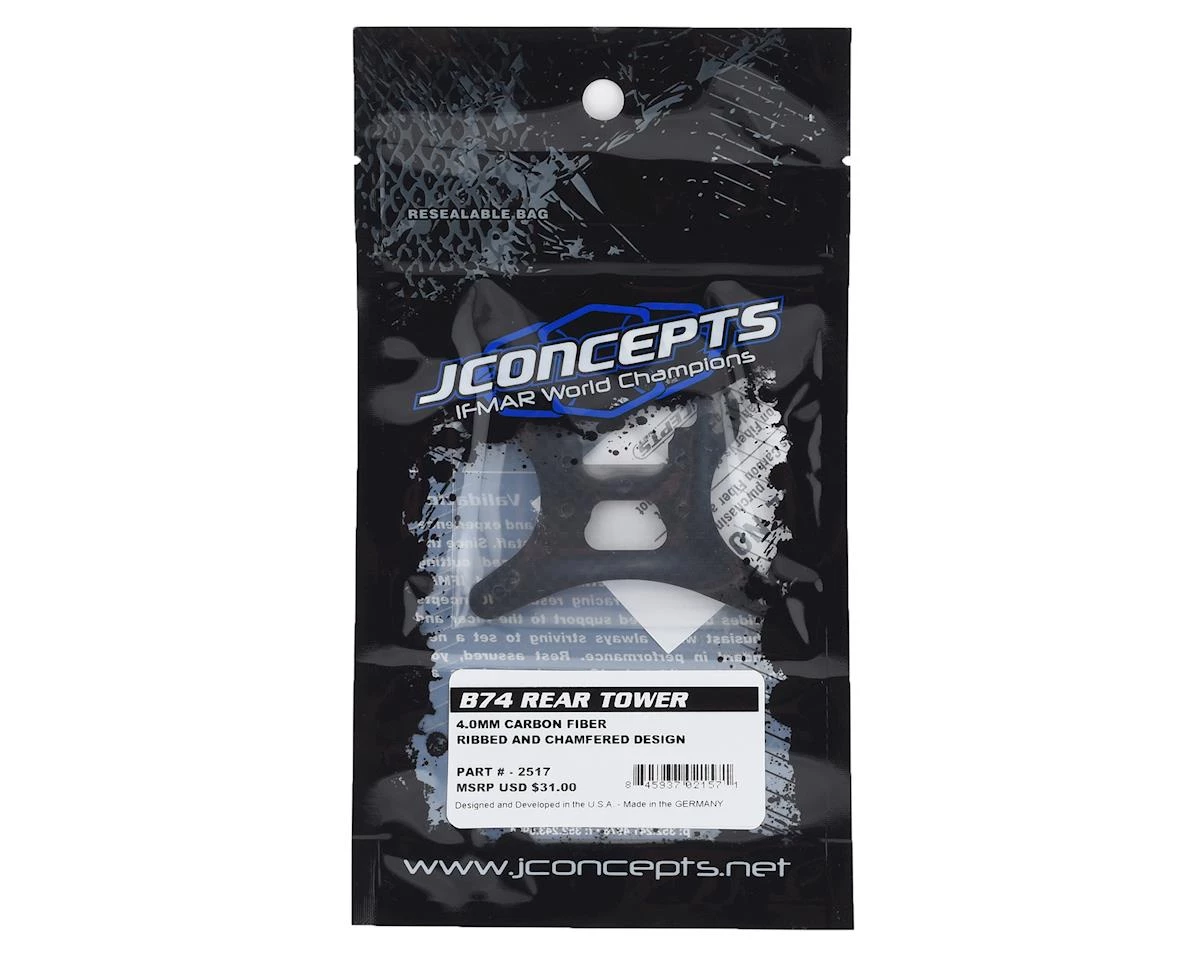 This is a JConcepts RC10B74 Carbon Fiber Rear Shock Tower, intended for use with the Team Associated RC10 B74 Team 1/10 Electric Buggy Kit. The 4mm thickness, genuine Carbon Fiber material is durable, light-weight and features the JConcepts milled sections which help maintain strength while minimizing weight. The 3 standard (B74) shock positions remain for quick and steady adjustments in the correct position for the rear shock geometry. The tower features the JConcepts treatment of ribbed sections and chamfered edges on the surface of the exotic material. The tower is complete and designed to accept the stock mounting hardware.