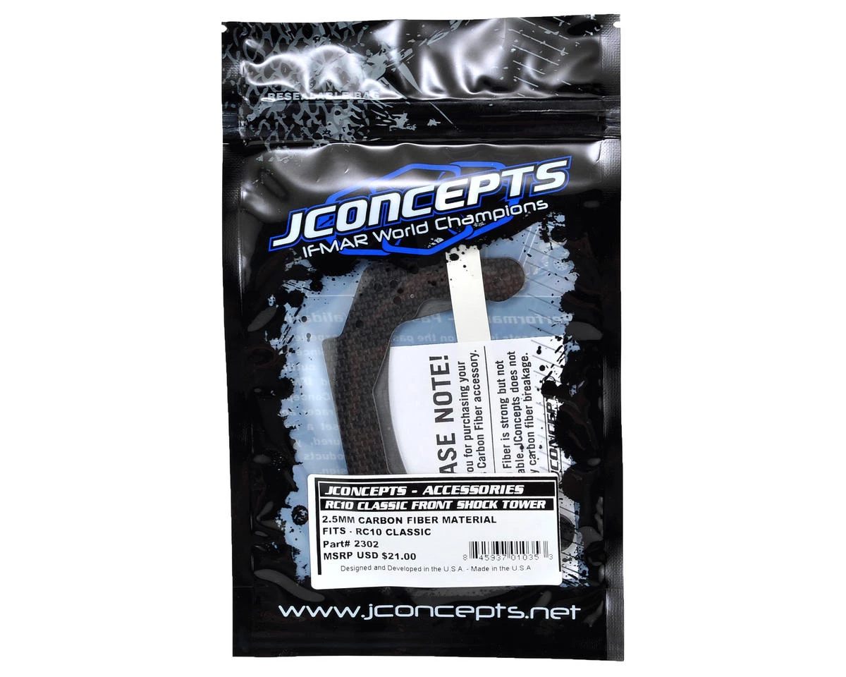 This is an optional JConcepts RC10 Classic 2.5mm Carbon Fiber Front Shock Tower. The RC10 has been reintroduced to the public and option parts are in high demand. JConcepts is ready for action with a Carbon Fiber option for the front shock tower. The stock vehicle comes standard with a fiberglass unit which carries all the original geometry; however, it lacks the pizzazz, strength and appearance that Carbon Fiber can provide. The shock tower maintains the classic geometry but includes detailed reinforced areas adding strength in key areas as well as the improvement in material creates a more rigid feel, increasing response in the front-end. Replace the fiberglass and go with authentic 2.5mm Carbon Fiber by JConcepts.