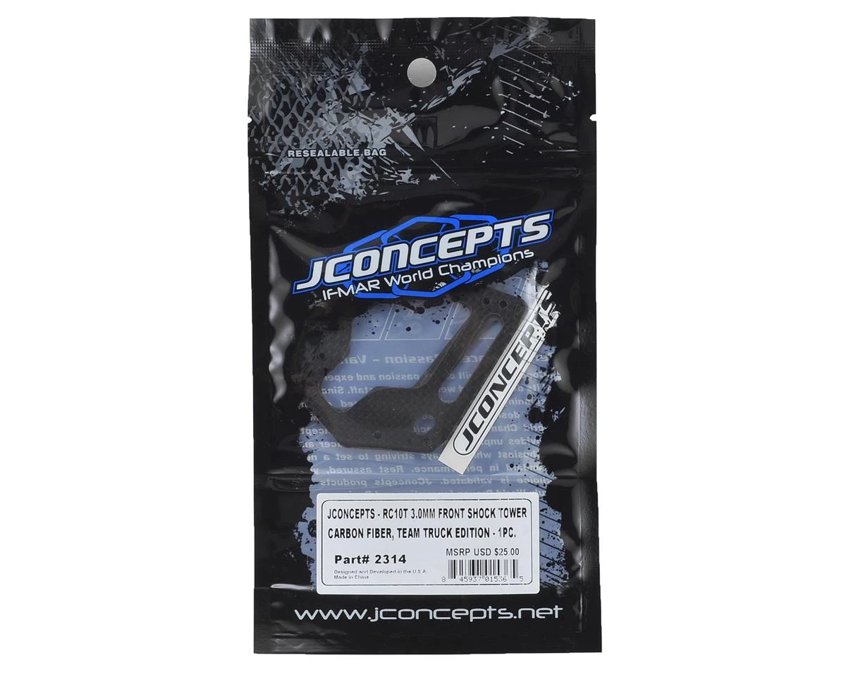 The JConcepts RC10T Team Truck 3.0mm Carbon Fiber Front Shock Tower is a direct replacement upgrade for the standard fiberglass tower. The front shock tower includes the Team Truck geometry for the best handling characteristics from that era. The tower includes detailed reinforced areas, adding strength in key areas as well as the improvement in material creates a more rigid feel, increasing the response in the front-end. Replace the fiberglass and go with authentic 3.0mm Carbon Fiber by JConcepts.