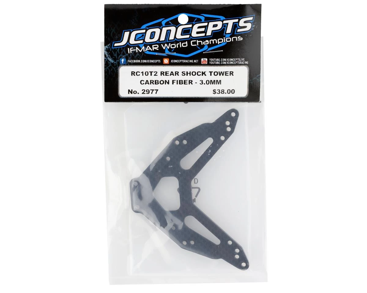 The JConcepts RC10T2 Carbon Fiber Rear Shock Tower is an excellent upgrade for the iconic RC10T2 chassis. With parts being difficult to find for this rare vehicle this 3mm thick carbon fiber upgrade is a great choice to replace the stock fiberglass unit. This tower uses stock shock geometry to preserve the handling of the original while improving durability and consistency. Package includes one rear shock tower.