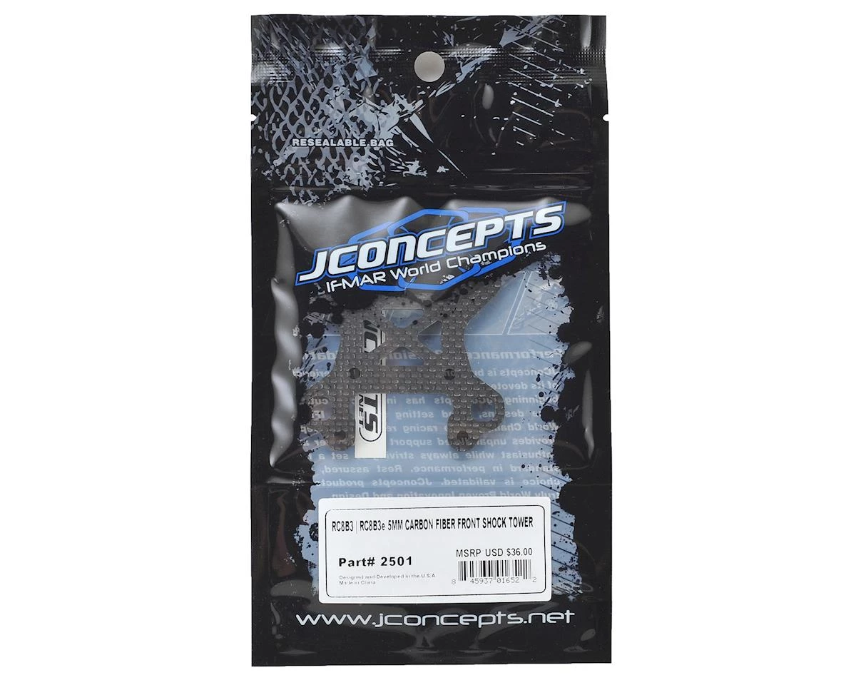 The JConcepts RC8B3 5mm Carbon Fiber Front Shock Tower helps to shed some weight from the Team Associated RC8B3 and RC8B3e buggies. The geometry locations of the stock front shock tower have been perfectly duplicated in a more compact 5mm thick package, making this a lightweight, direct bolt-on option part. Reinforcement ribs have been added where needed for additional strength.