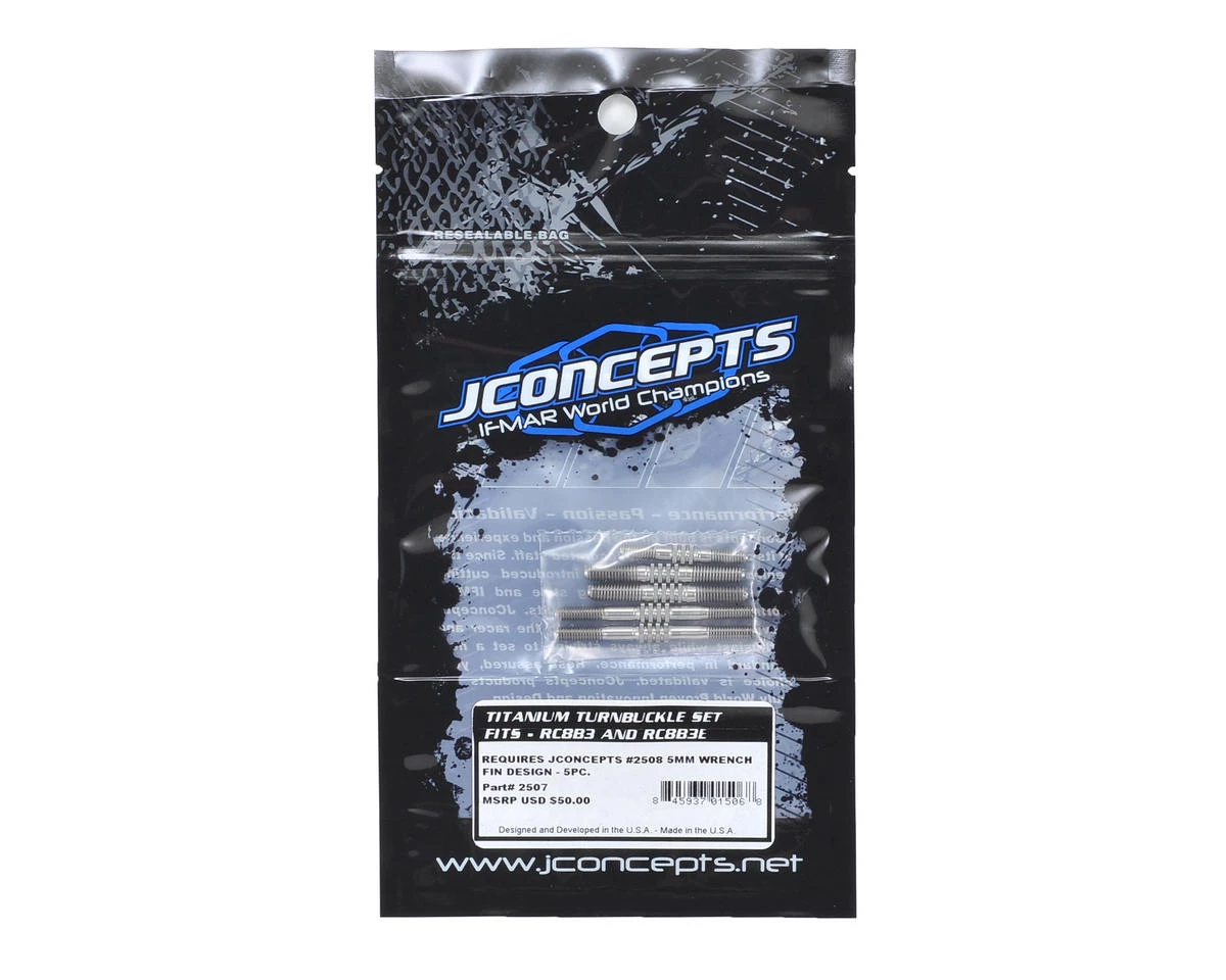 The JConcepts RC8B3 Fin Titanium Turnbuckle Set features a shaft design that is centered on a beefy 5mm square titanium shaft which gradually tapers down into a thread base design which accepts the rod ends included with the kit. The focus of the styling surrounds the lengthened adjustment area and the “finned” cuts that rotate about the center.