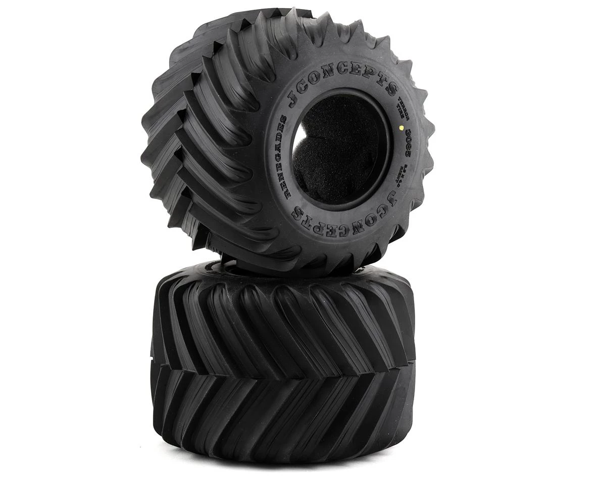 The JConcepts Renegades 2.6″ Monster Truck Tires are a great option for the Losi LMT, Traxxas Maxx, E-Revo and Arrma Kraton and similar trucks. These tires are made to mount to the JConcepts JCO3414 or JCO3423 2.6×3.8″ Wheels.