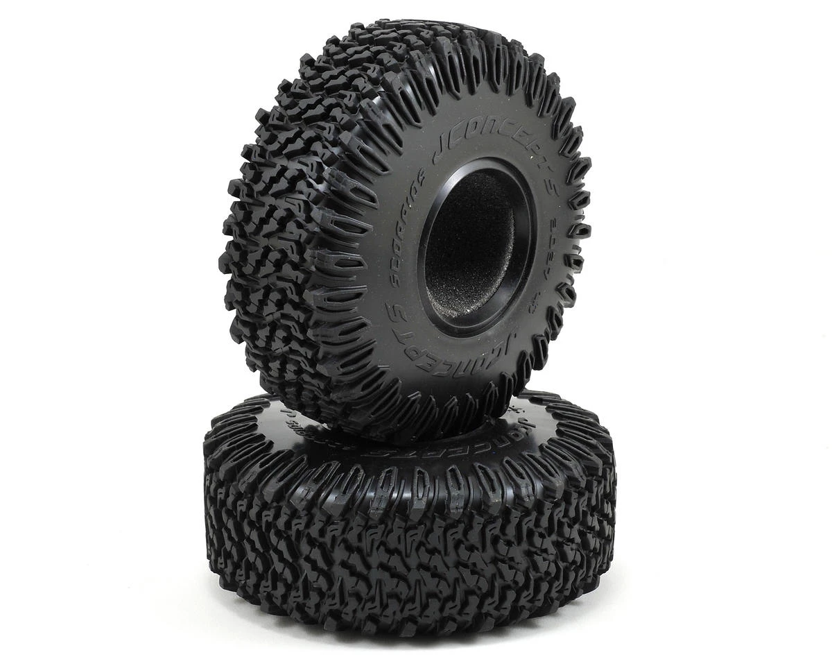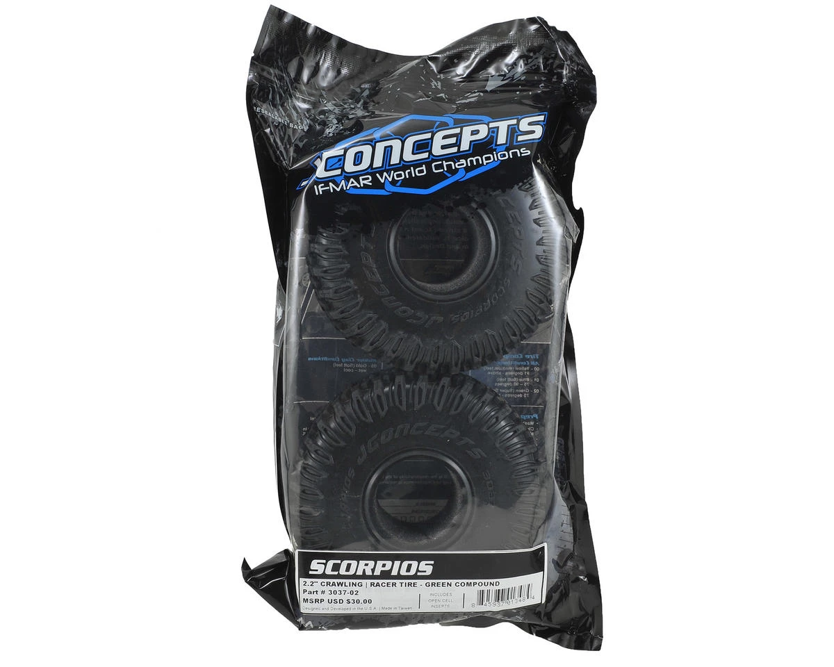 This is a pack of two JConcepts Scorpios 2.2″ Rock Crawler Tires. Ideal for vehicles like the Axial Yeti, the Scorpios feature scale looking tread, extra tall size (152mm) and profile. Starting by analyzing the tread, the design team focused on a closely knit tread arranging them in a pattern closely resembling a 1:1 scale tire. The padded arrangement of tread makes the tire ideal for transitioning from the hard road to dirt and then into rocky and uneven terrain. Once power is applied to the vehicle, the tread spacing opens up which allows for some deep digging making it a great working tire in dirt and muddy conditions.