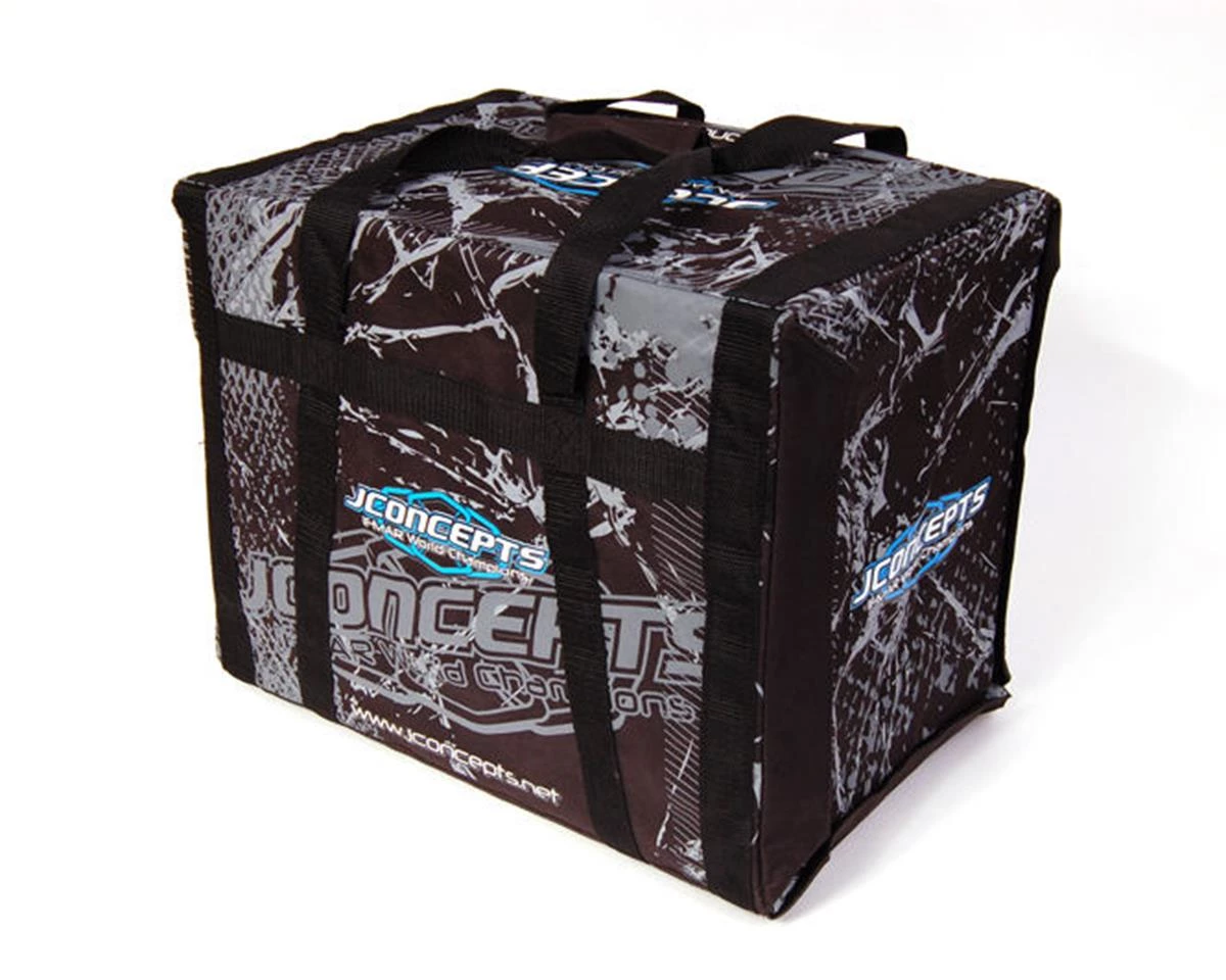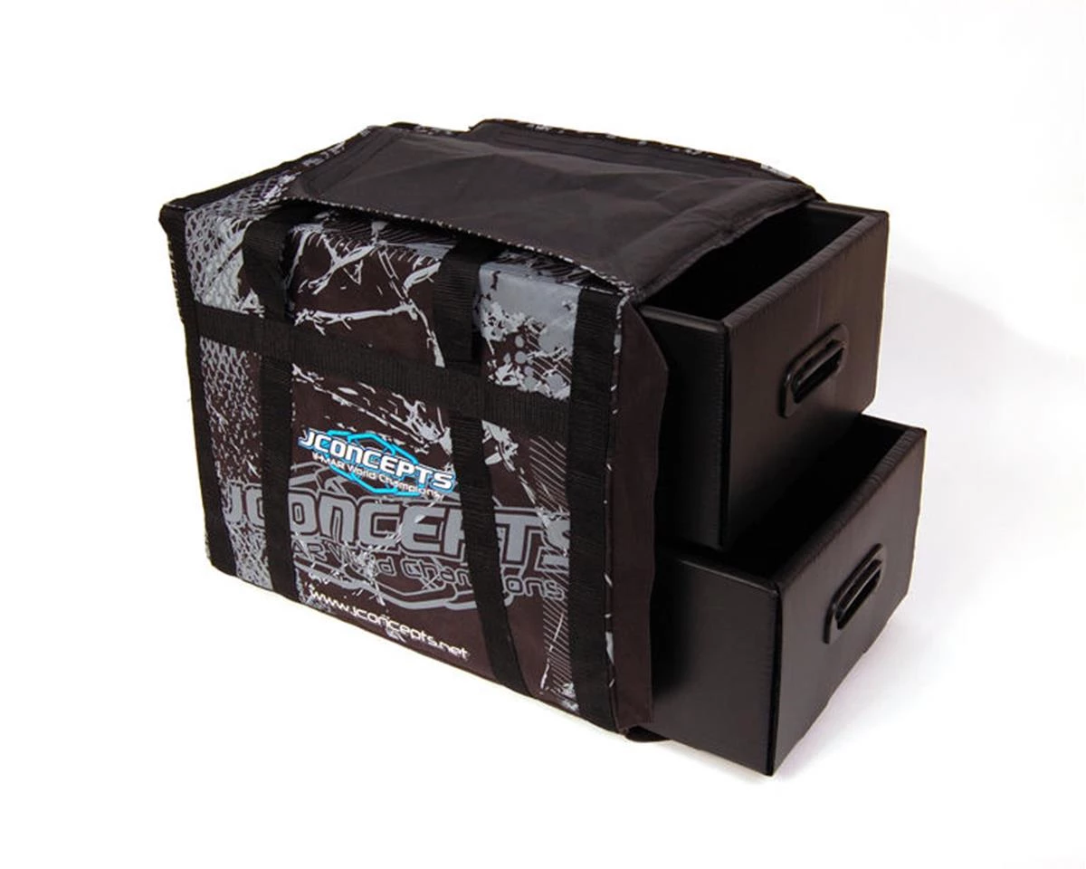 The JConcepts Small Finish Line Racing Bag is a compact 18”L x 14″H x 12″W size, multi-purpose equipment bag that is ideal for a variety of your RC needs. Made from heavy duty woven fabric, there is enough room for 1/10th, 1/16th, 1/24th scale vehicles or touring cars as well as room for radio gear, tools, tires, or various other RC gear. JConcepts imagery and logos are embroidered on each side of the bag, while front-load hook and loop closure combined with composite inner liner allow for easy access to all drawers individually. Two composite drawers with dividers make the inner workings of the JConcepts racing bag nothing short of spectacular for the organized minded racer.
