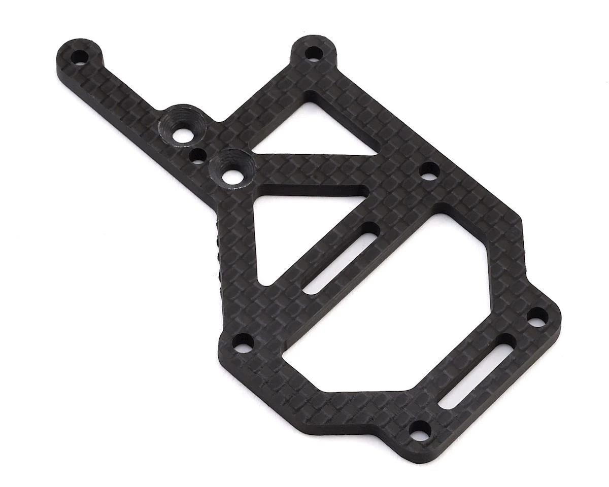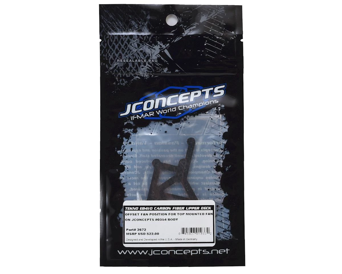 This is the optional JConcepts Carbon Fiber Off-Set Upper Deck Fan Mount for the Tekno EB410. JConcepts adds to the list of performance parts for the EB410 with a carbon fiber upper deck. The upper deck offsets the position of the fan mount which allows several benefits. The first is the ability to use the JCO0354 JConcepts F2 body as the carbon fiber part shifts the fan over to clear the low-profile cab of the body.