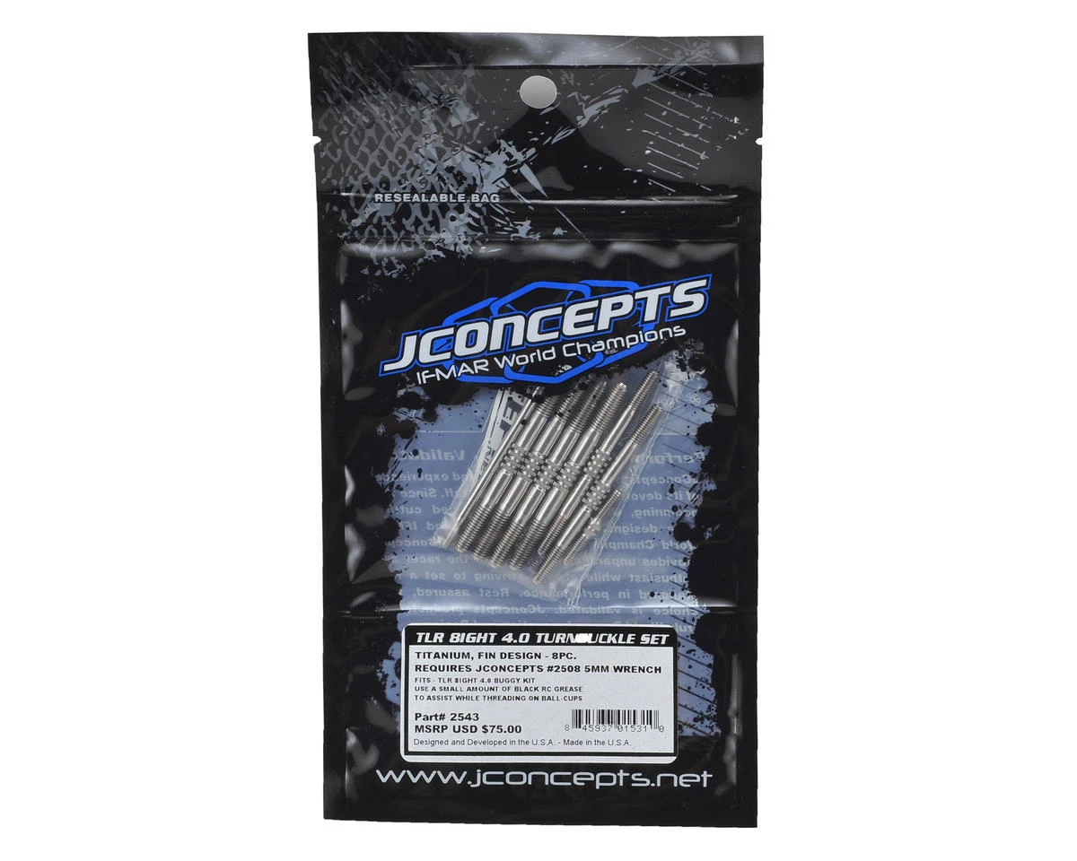 The JConcepts TLR 8IGHT 4.0 Buggy Fin Titanium Turnbuckle Set features a shaft design that is centered on a beefy 5mm square titanium size which gradually tapers down into a thread base design which accepts the rod ends featured in the kit. The focus of the styling surrounds the lengthened adjustment area and the “finned” cuts that rotate about the center. The TLR kit is unique and features two additional turnbuckles, one for the throttle and one for the steering linkage. The additional turnbuckles have also been optimized and included in the 8-piece set. The focus of the styling surrounds the adjustment area and the “finned” cuts that rotate around the center.