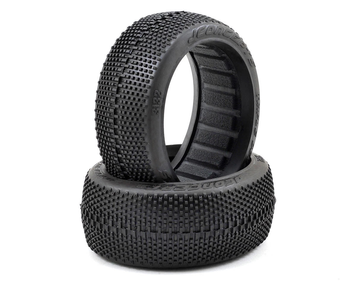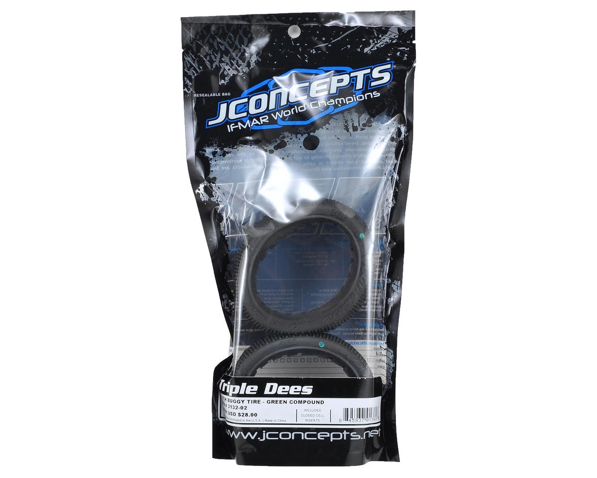 JConcepts Triple Dees 1/8th Buggy Tires were developed for loose and tacky track conditions that require a small pin tire. Starting with finely spaced square mini lugs, the JConcepts design team spent considerable time proofing the design. Center bar structure is important for wear characteristics and an overlapping and blended center bar was created.Ā