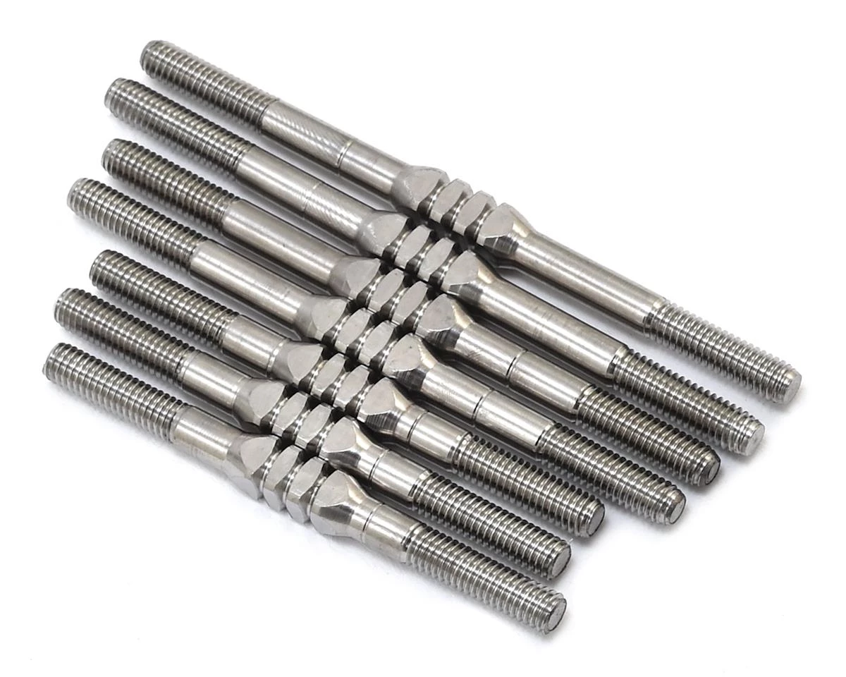 The JConcepts Yokomo YZ4-SF Fin Titanium Turnbuckle Set was designed specifically for style, durability and performance. The base of the shafts design is centered on a .143” titanium hex size which gradually tapers down into a 3mm thread base design which accepts the standard Yokomo ball-cup configuration. The focus of the styling surrounds the lengthened adjustment hex area and the “finned” cuts that rotate about the center. The Fin turnbuckles are lightweight and the original design brings out the glamour and quality that makes titanium one of the most sought after exotic materials in the world. The JConcepts turnbuckles are produced with left and right hand threads, the left conveniently marked for easy orientation.
