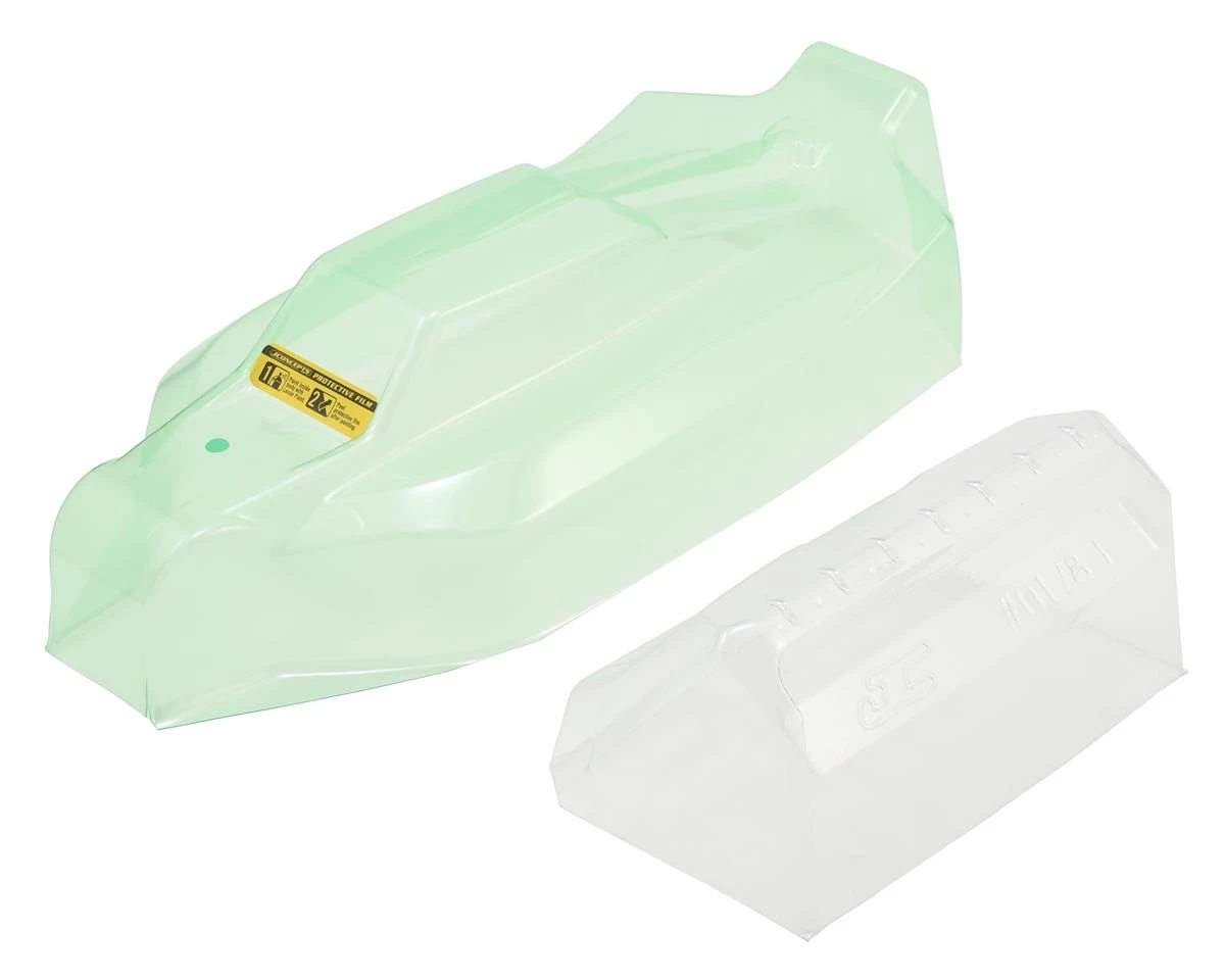 This is the “Lightweight” JConcepts “S1” 4WD Buggy Body for use with the Yokomo YZ-4 SF. A ground up design, the Silencer, has elements created for the high speed tracks. A profiled cockpit and cubicle side-pod gives the Silencer an immediate fighting appearance. A smooth, high-speed transition around the cab keeps the Silencer heading in the right direction. A slight recess just behind the cab with channeling out the rear provides rear-end stability. The Silencer side-pods have a clipped rear-end, narrowing the rear by angling in just in front of the rear tires. The rear side-pods angle sharply toward the shock tower and wing, enhancing the force placed on the rear pods during high-speed acceleration.